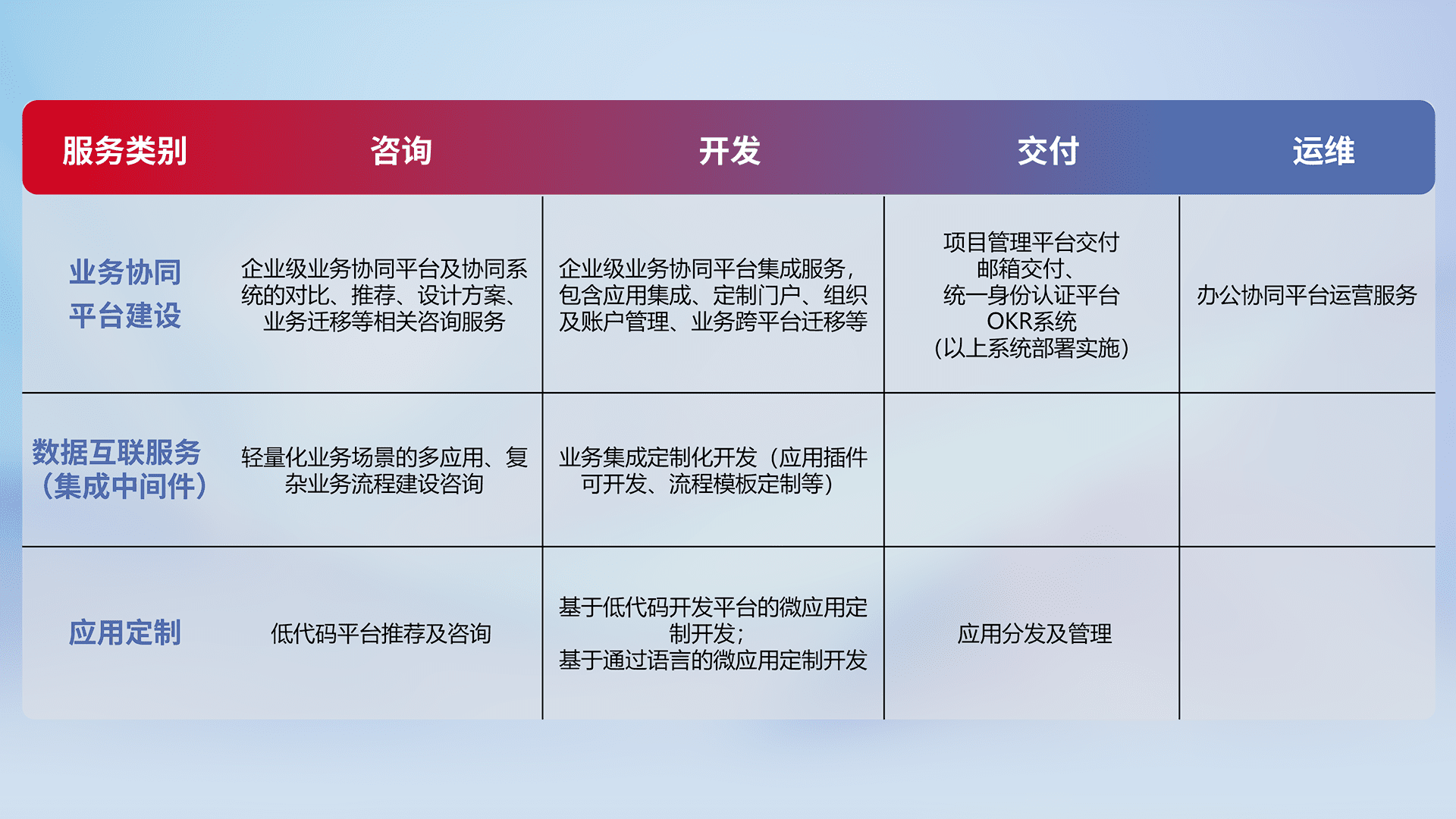 针对钉钉、、、企微、、、、IDaas等平台级产品提供产品的规划、、、、方案、、、、交付、、、定制化开发等服务,,实现如统一协同办公、、智能客户服务、、、、混合会议管理、、、、智能数据查询、、、等业务场景,,实现数字化转型。。。。